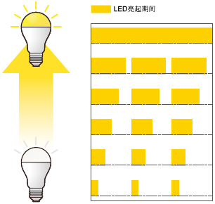 。脈沖信號是一種在ON 和OFF 之間反復(fù)交替的信號,ON期間在一個周期中的百分比被稱為" 占空比"。PWM 控制照明是一種通過控制來自脈沖發(fā)射源光占空比(發(fā)光時間)來控制燈亮度的方法。 發(fā)光時間越長,光就會變得越亮;反過來,發(fā)光時間越短,光就會變得越暗。