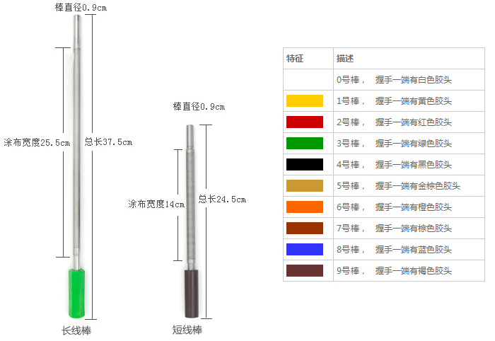 短線棒的總長度是24.50 cm,涂布寬度: 14 cm;0號~4號短線棒的直徑是0.3cm,5號~9號短線棒的直徑是0.9cm。