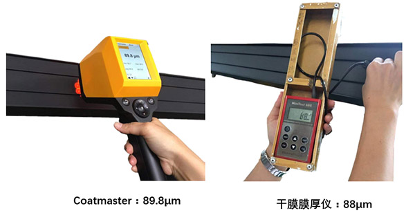 用兩種膜厚測試方法在鋁型材上同一位置分別測試未固化和已固化的膜厚