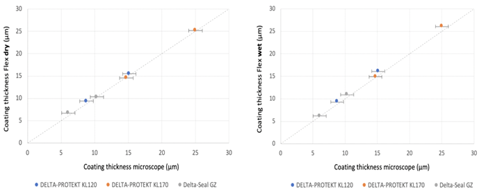 圖六:比較顯微鏡法和Flex在干燥狀態(tài)下測(cè)量涂層厚度(左:Flex測(cè)量干膜,右:Flex測(cè)量濕膜)。兩種測(cè)量設(shè)備具有很高的相關(guān)性(R2 = 0.998)。顯微鏡測(cè)量法的標(biāo)準(zhǔn)誤差小于1.5 μm,coatmaster Flex的測(cè)量標(biāo)準(zhǔn)誤差小于0.3 μm