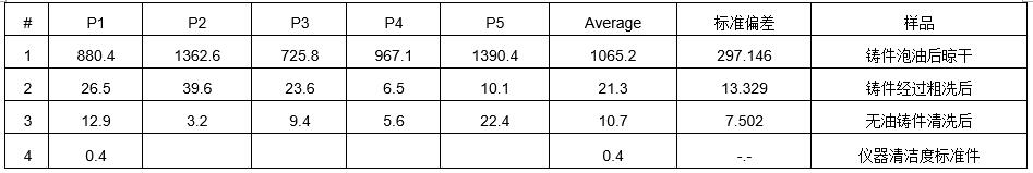 1 | 在會(huì)議室的零件測試 | 3件樣品: 鑄件泡油后晾干、鑄件經(jīng)過粗洗后、無油鑄件清洗后 |