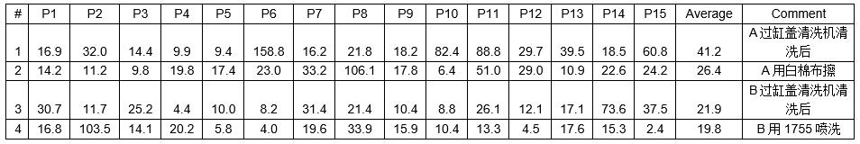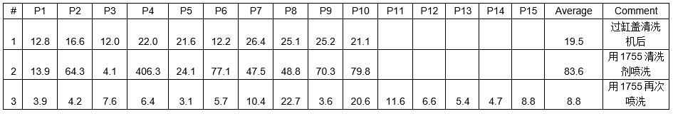 1、 用1755第一次噴洗,有一測量點(diǎn)的清潔度為RFU460,導(dǎo)致整個(gè)工件的清潔度平均值大幅升高。 此測量點(diǎn)的污染情況估計(jì)是由于1755噴洗時(shí)引起孔洞里的油污流出再次污染表面而造成。