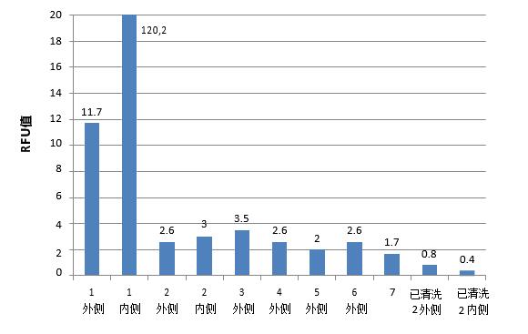 樣品 2 -7 的熒光值相對較小,而經(jīng)過清洗的樣品 2 的熒光值分別為:外側(cè) 0.8 RFU,內(nèi)側(cè) 0.4 RFU。